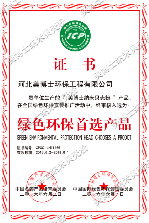 以其得天獨(dú)厚的優(yōu)勢(shì),河北美博士環(huán)保工程有限公司生產(chǎn)的“美博士納米貝殼粉”產(chǎn)品在全國(guó)綠色環(huán)保宣傳推廣活動(dòng)中,于2016年6月1日和2日經(jīng)中國(guó)名牌產(chǎn)品培育委員會(huì)和中國(guó)國(guó)際綠色環(huán)保管理委員會(huì)審核入選為綠色環(huán)保首選產(chǎn)品,有效期為2016年6月2號(hào)至2018年6月1號(hào)。