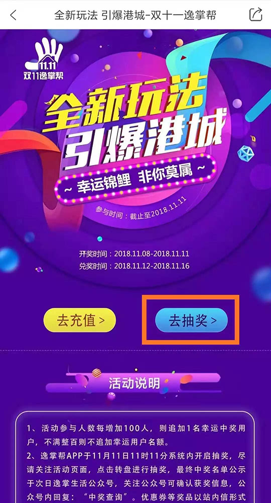 1,逸掌幫APP于11月11日11時11分系統(tǒng)內(nèi)開啟抽獎,,敬請關注活動頁面,點擊轉(zhuǎn)盤進行抽獎,最終中獎名單公示于逸掌幫官方服務號。關注逸掌幫服務號,服務號內(nèi)回復:“中獎查詢”,可確認獲獎信息。優(yōu)惠券等獎品以APP站內(nèi)信形式直接發(fā)送至用戶APPID,屆時請注意查收。